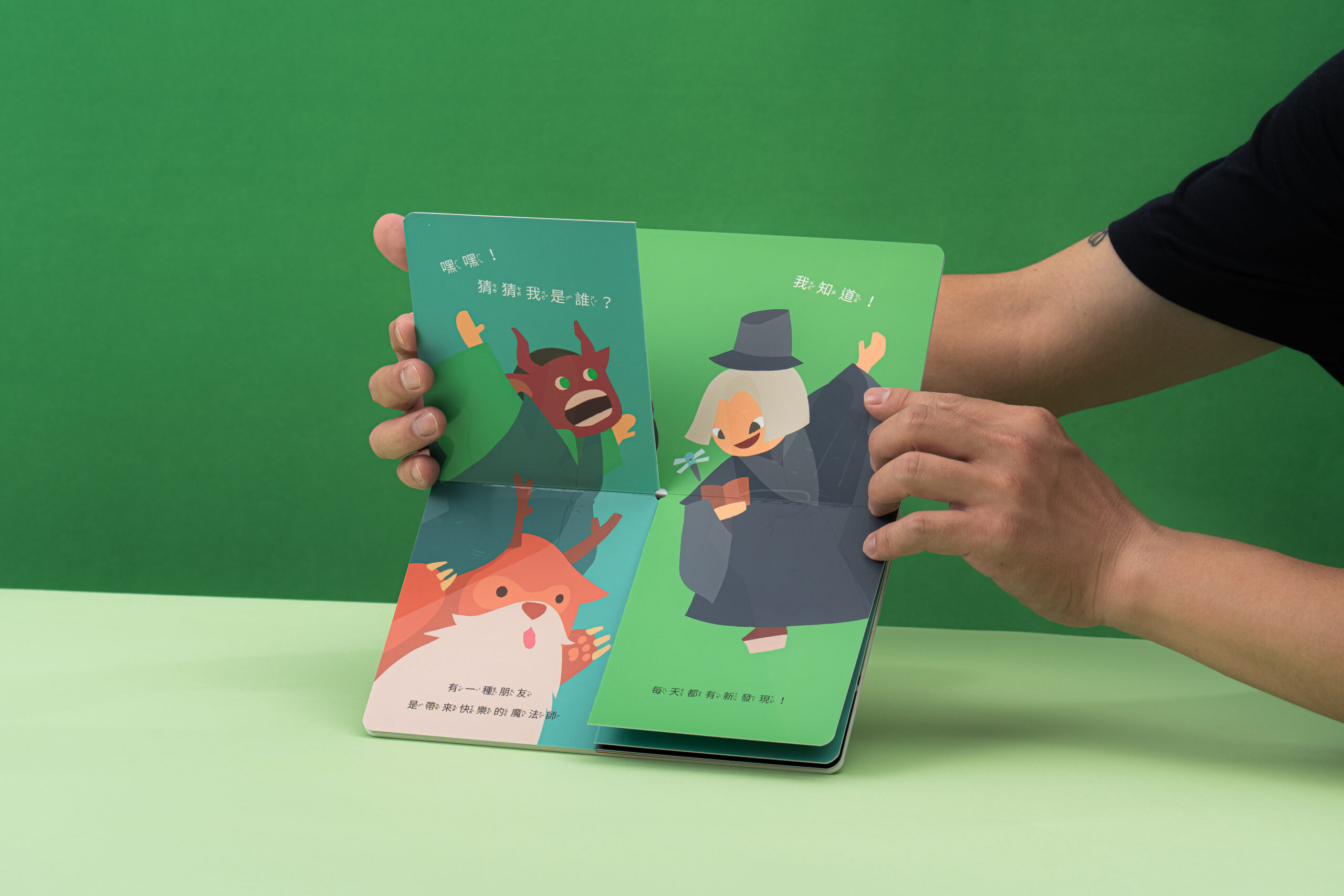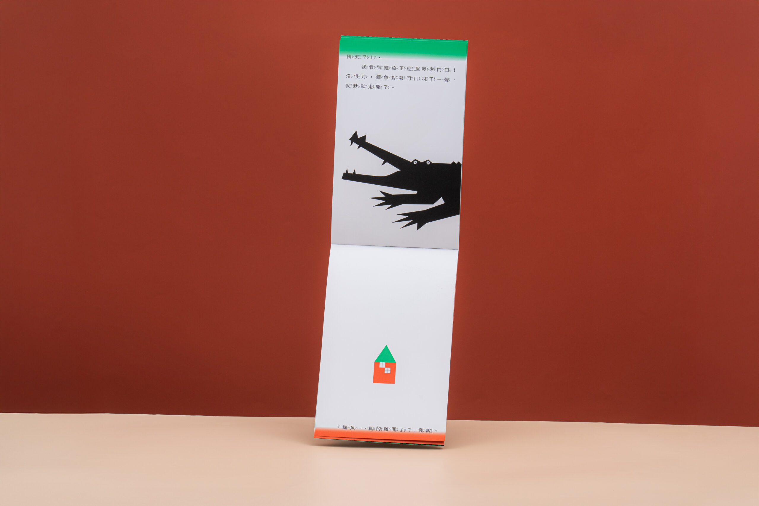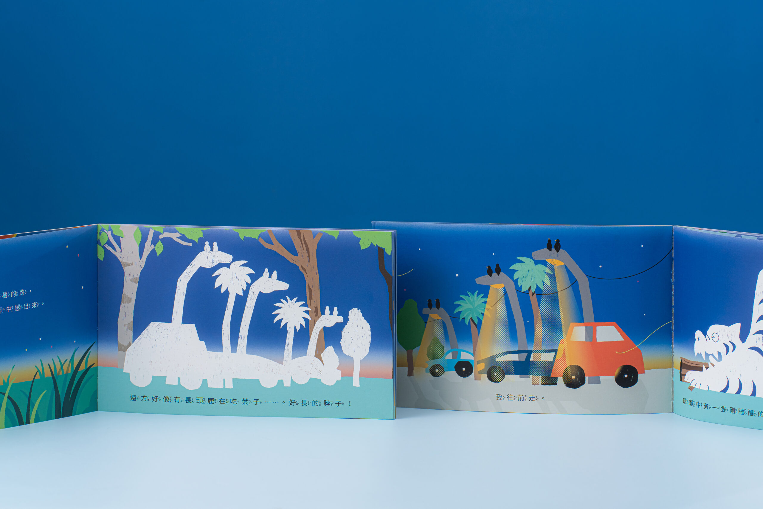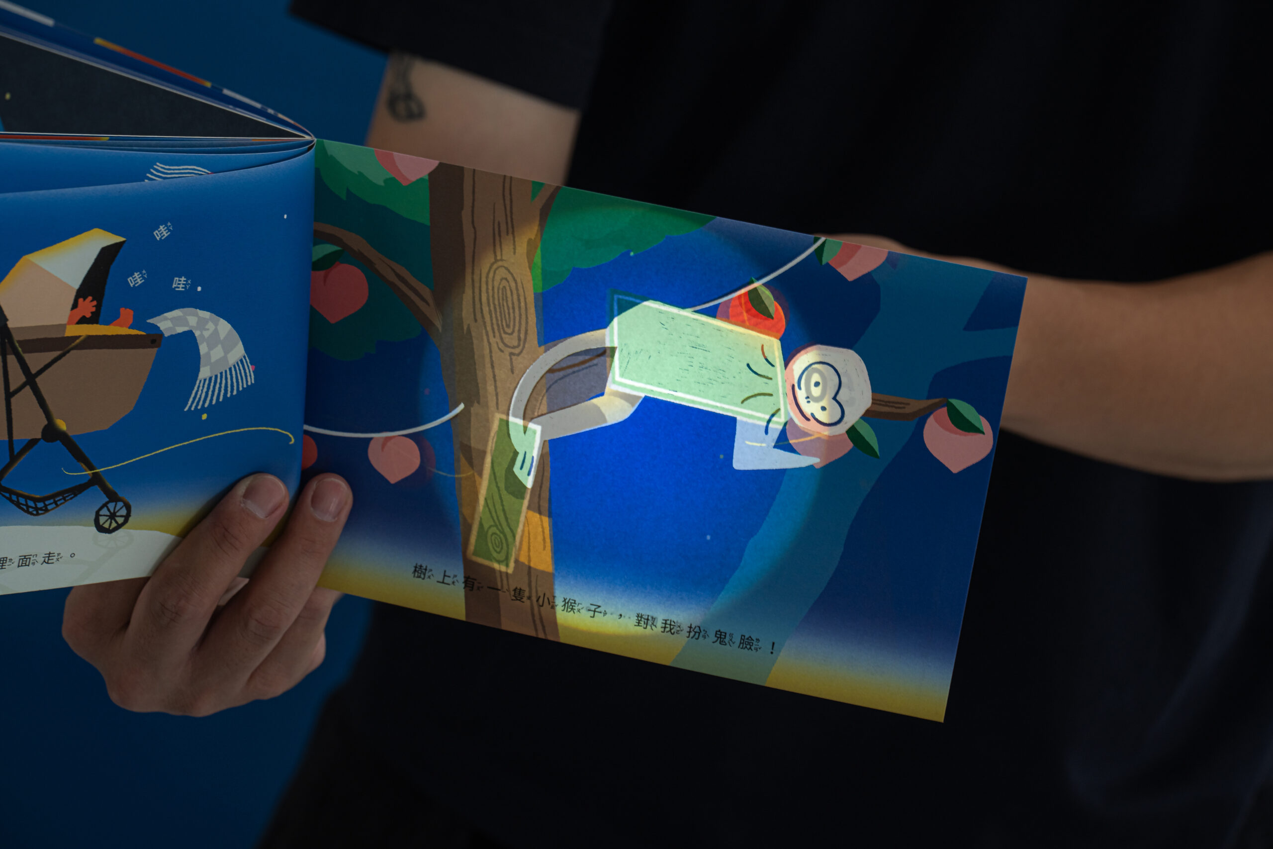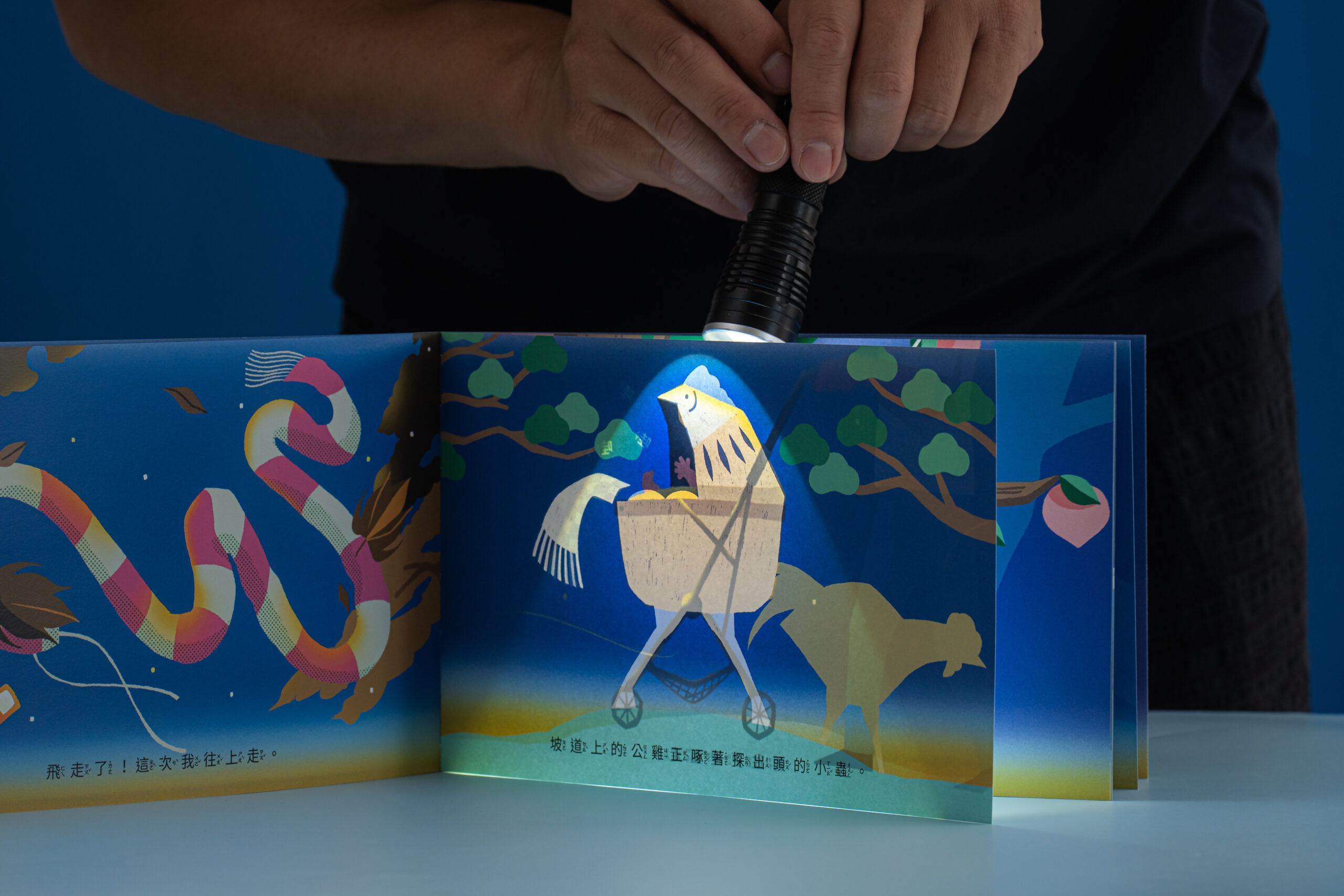 互動設計前頁白紙、後頁透色的構造,在燈光照射下,呈現光影與色彩的變化,宛如皮影偶般栩栩如生。左翻式的閱讀動線,則呼應皮影戲橫向的操縱方式,使本書成為承載故事的迷你戲台。