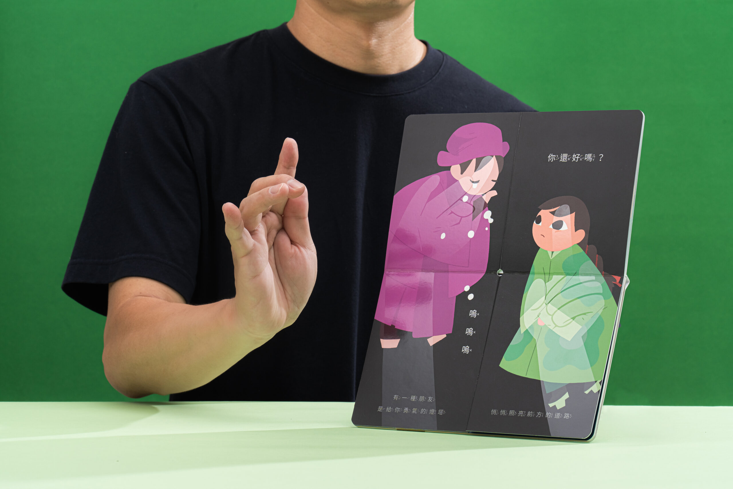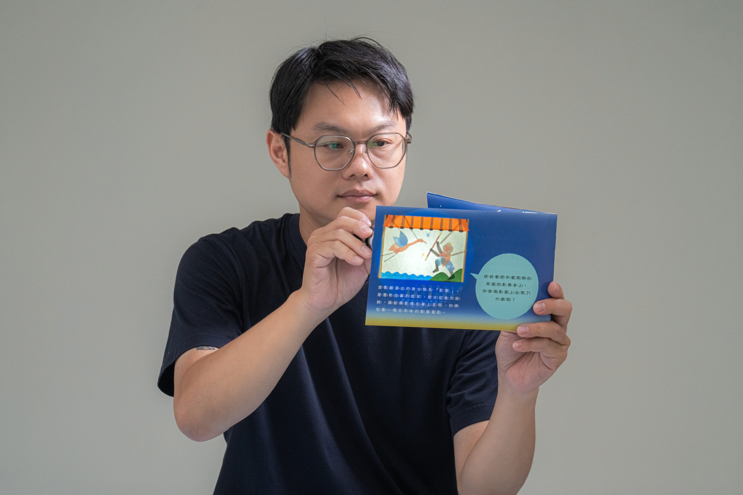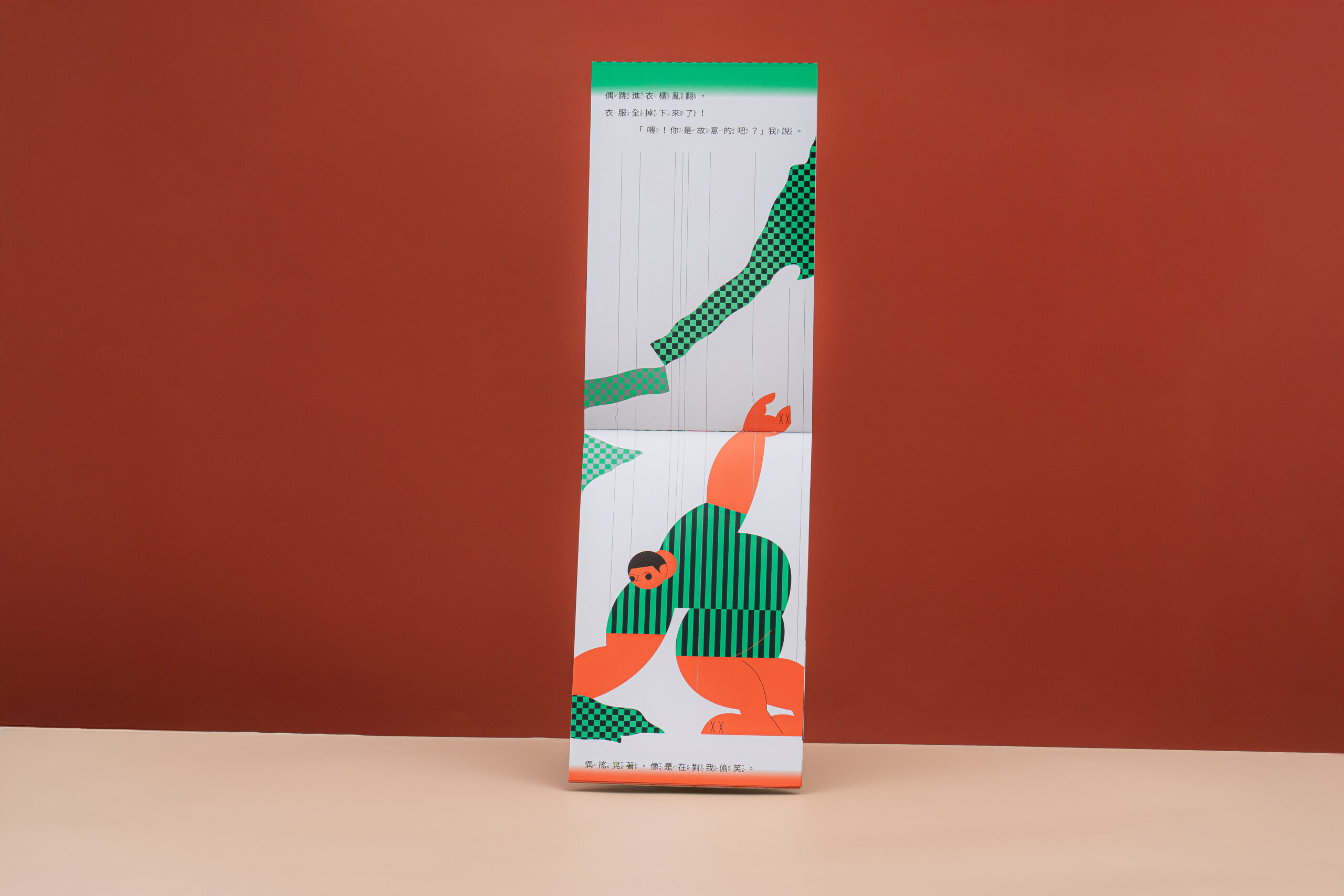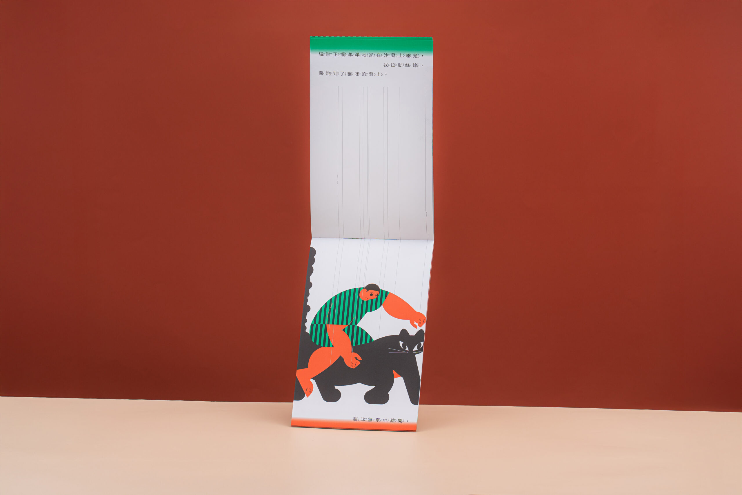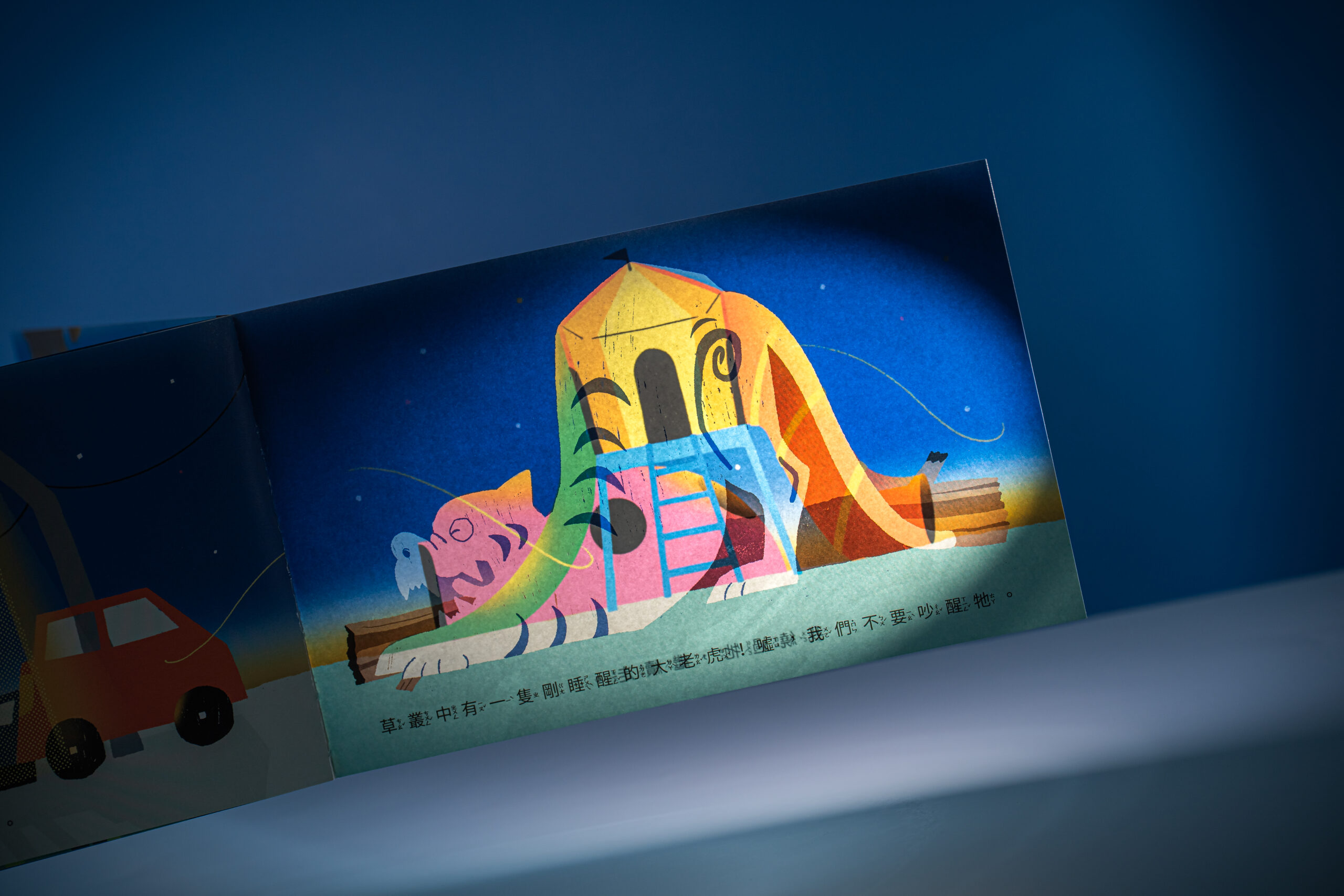 互動設計前頁白紙、後頁透色的構造,在燈光照射下,呈現光影與色彩的變化,宛如皮影偶般栩栩如生。左翻式的閱讀動線,則呼應皮影戲橫向的操縱方式,使本書成為承載故事的迷你戲台。