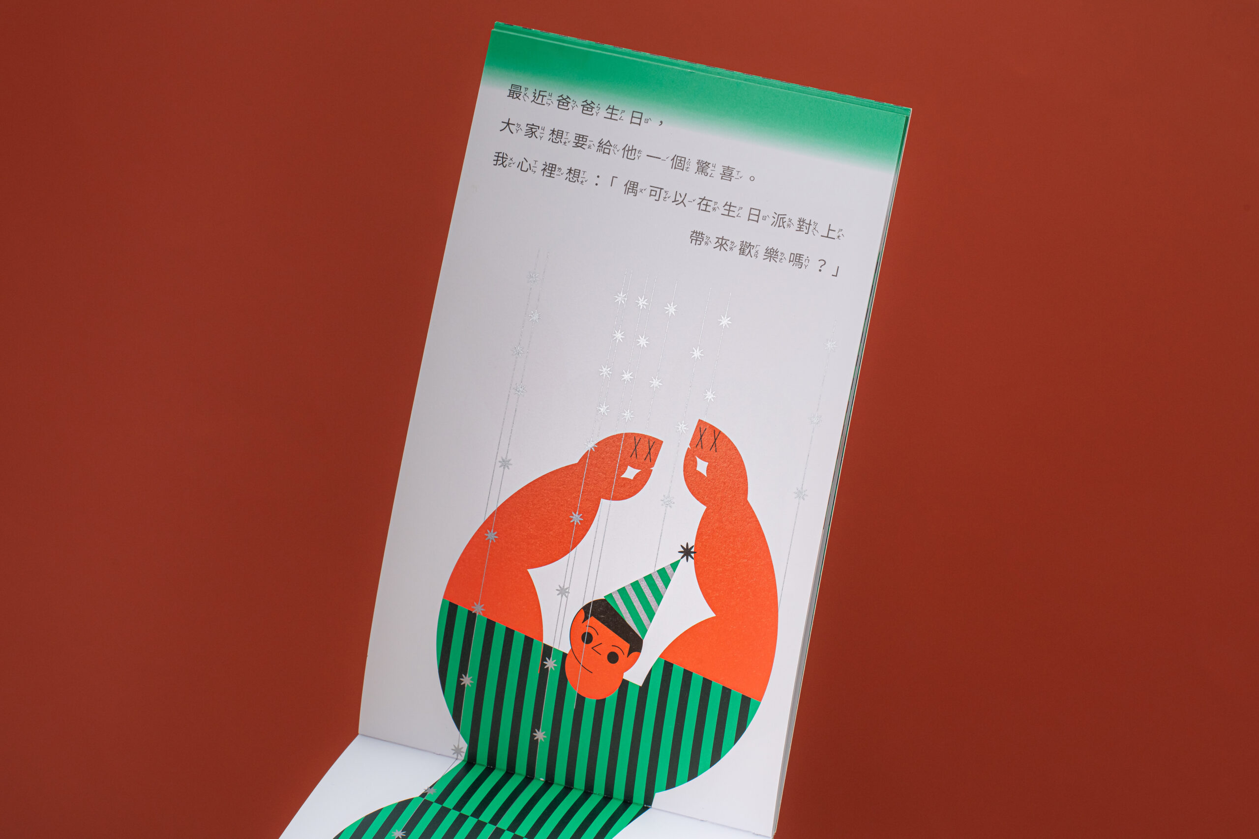 絲線採用特色銀印刷,翻閱時如同施展魔法般閃亮奇幻。每一頁皆以偶為主角,搭配敘事指示,引導讀者觀察傀儡獨特的擺動姿態。上翻式的閱讀動線,則呼應傀儡戲「以上弄下」的操偶方式。