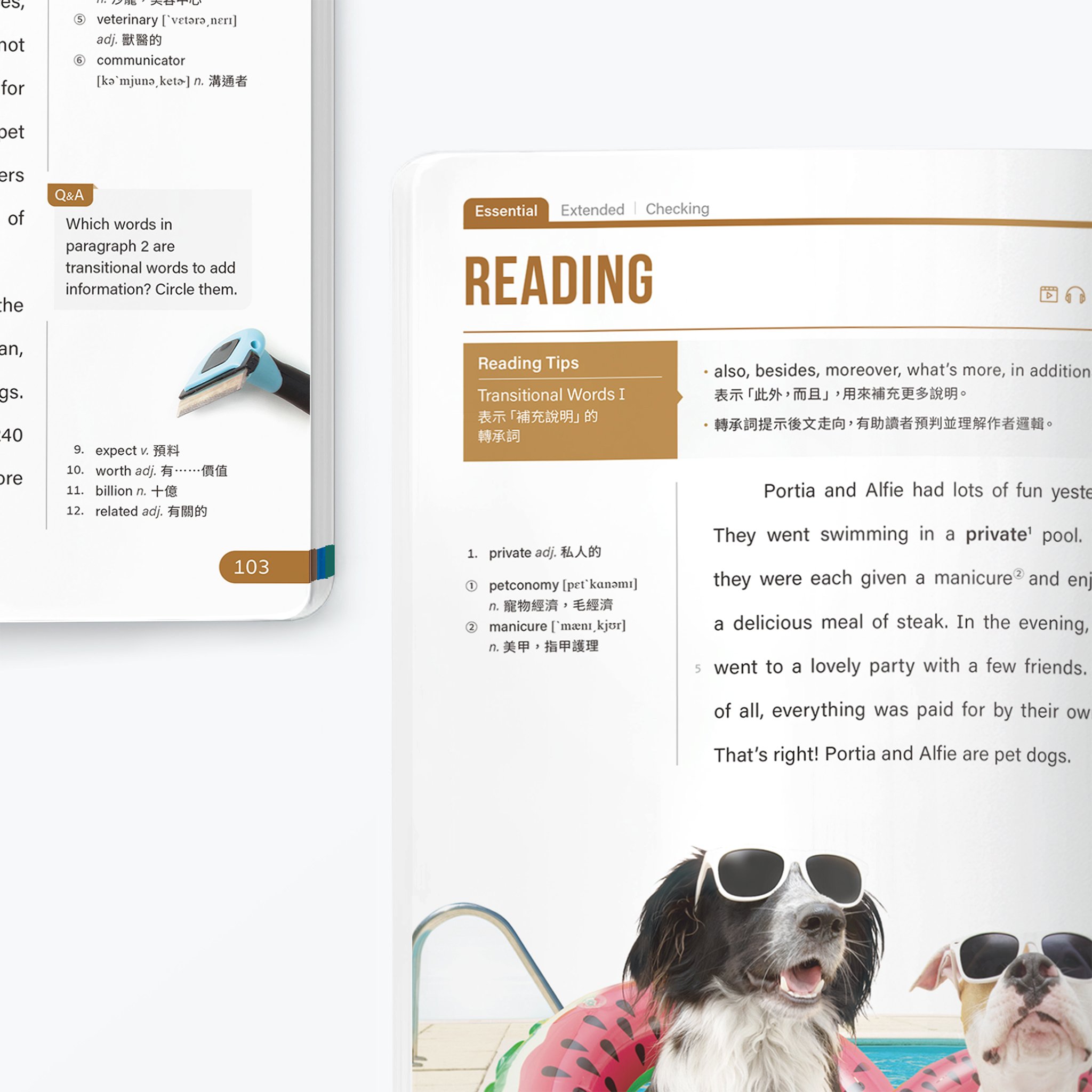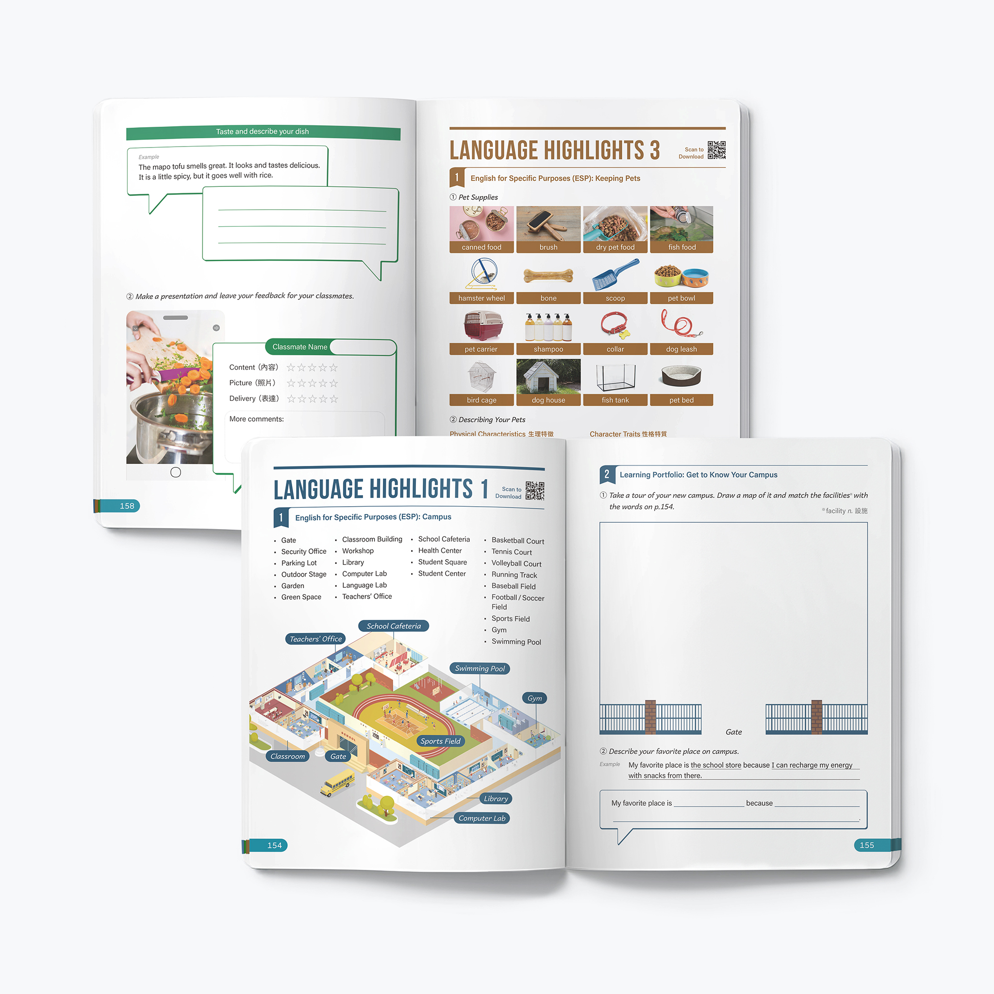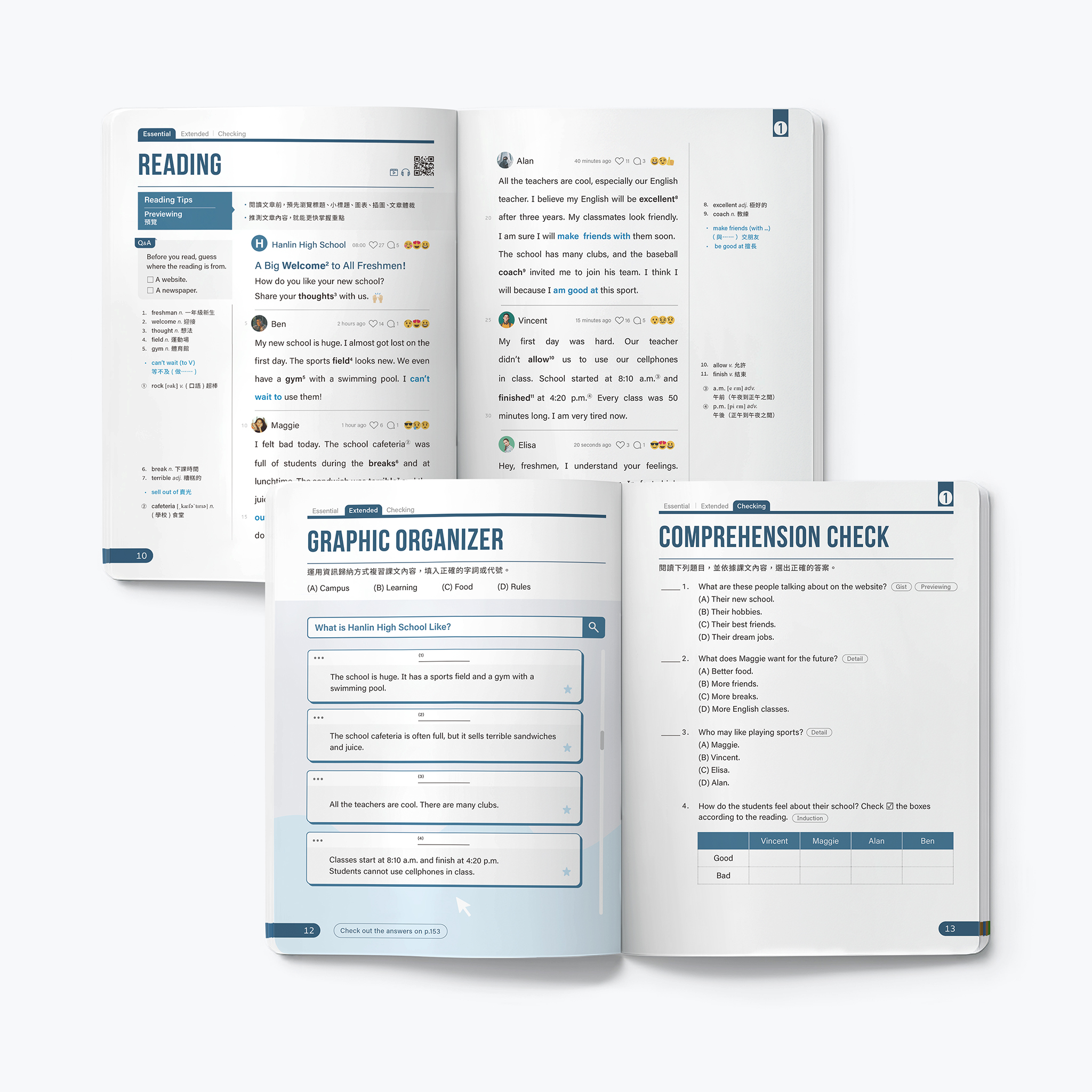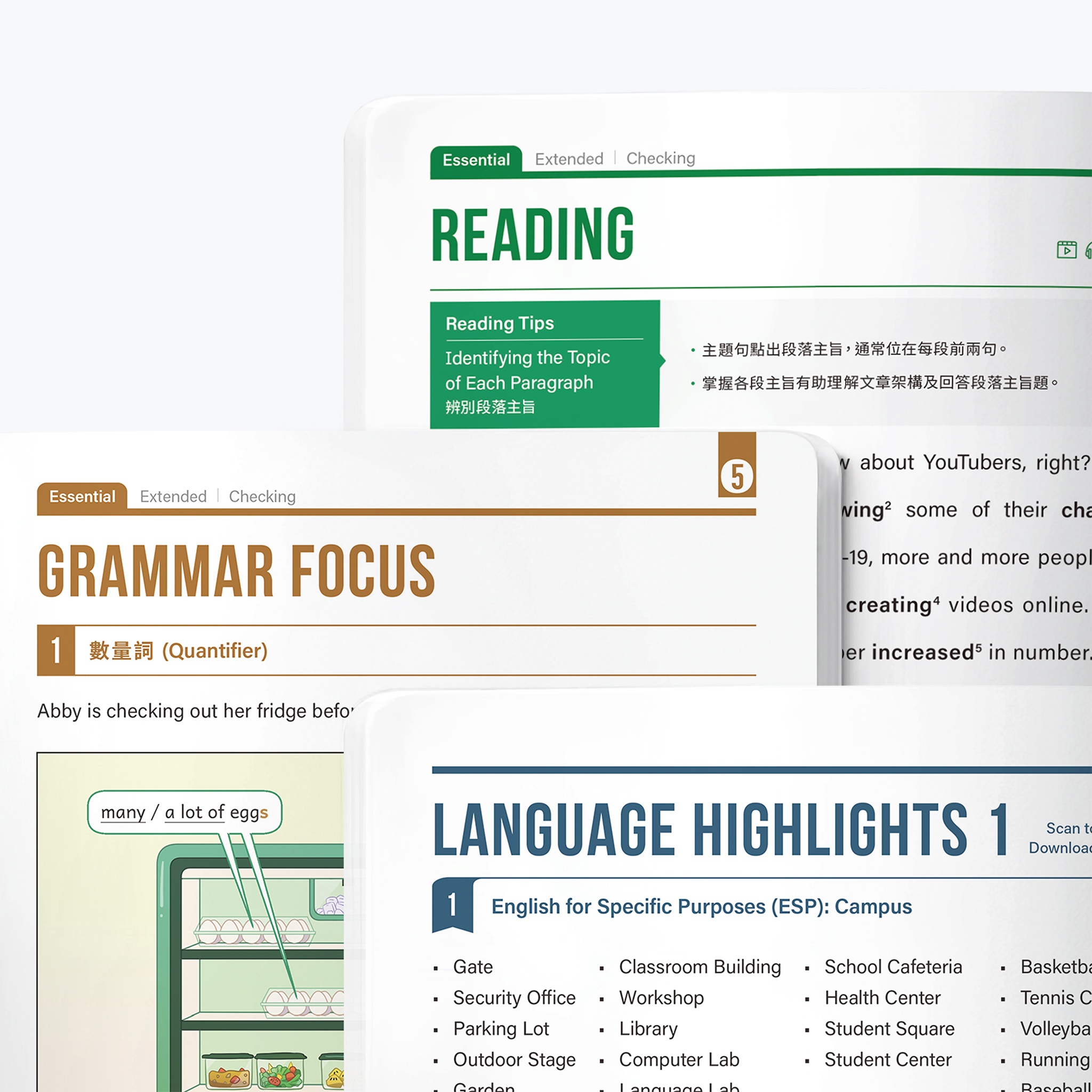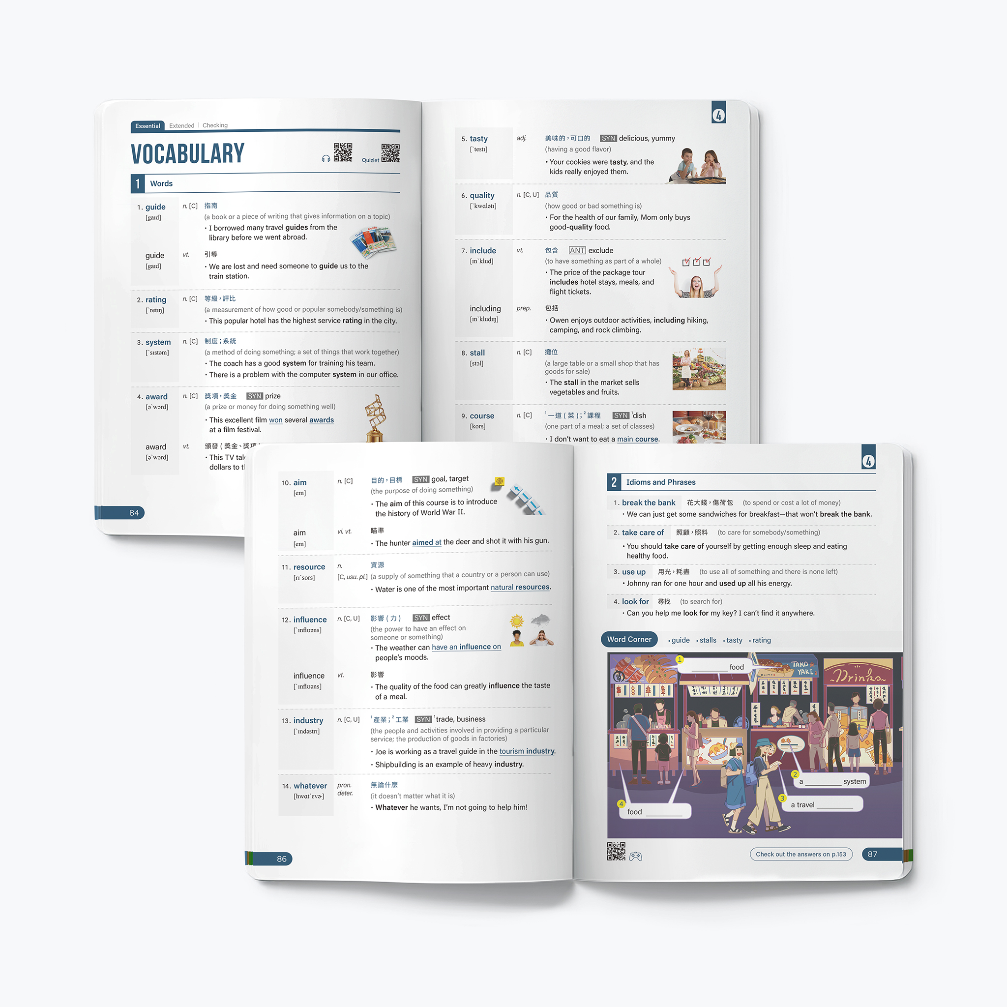 透過設計,希望這本專為技高學生量身打造的英文課本,不僅是知識的載體,更能成為培養學生學習自信的伙伴。藉由融合英文風格的情境插畫與圖照輔助,學生能快速掌握學習重點,讓英文變得輕鬆又有趣!